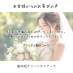 さぬき市 曽◯様 ブライダル整体 結婚式準備の疲れがピークに達した時に、駆け込みで利用させていただきました。 初めての整体で少し緊張しましたが、体の状態や悩みを丁寧に聞いてくださり安心できました。 施術後は、身体全体が嘘 […]