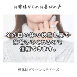 横浜市 白◯様 顔、身体の歪みが気になりお世話になってます。かなり楽になりました! 相談もしやすく、その日の体の状態を見て施術してくれるので信頼できます。 これからも定期的に通いたいと思います。