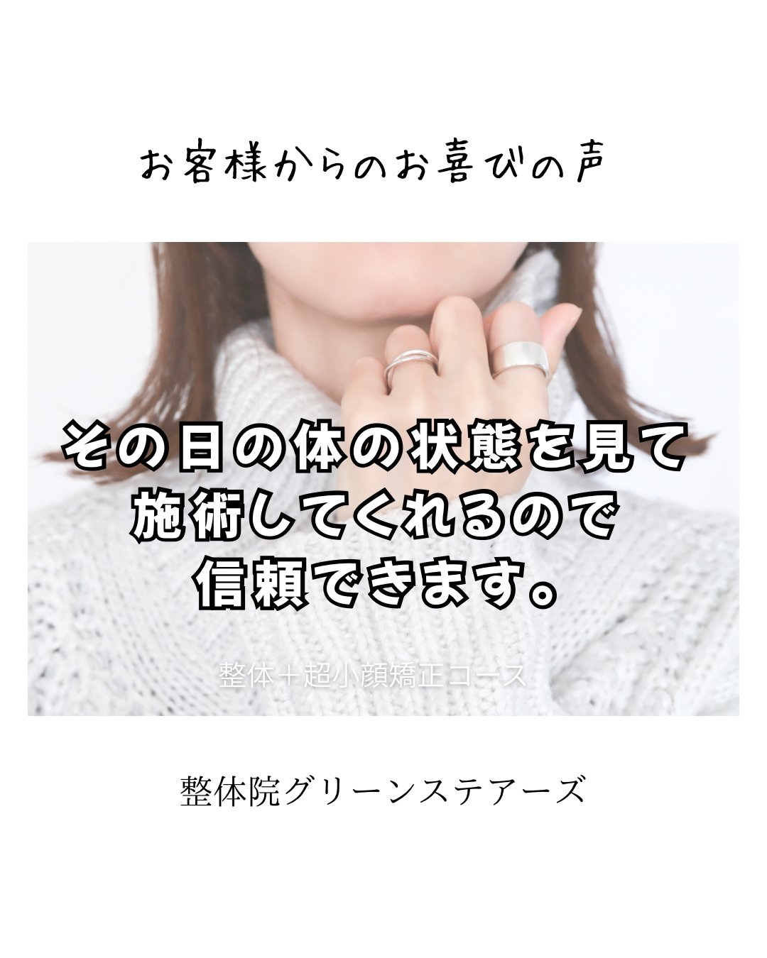 整体後のご感想をいただきました。 2026年2月6日 KUBO式整体 お客様の声と紹介 横浜市 白◯様 顔、身体の歪みが気になりお世話になってます。かなり楽になりました! 相談もしやすく、その日の体の状態を見て施術してくれるので信頼できます。 これからも定期的に通いたいと思います。 タグ : 高松市整体院グリーンステアーズ 関連記事 妊娠検査薬にうっすら線が・・・妊活整体お喜びの声 なかなか妊娠できず、藁をもつかむ気持ちで訪ねた日のことを思い出すと、、妊活整体ご感想 通い始めて2回目の健診で…なんと!逆子が戻っていました!! 朝のむくみと左右差がひどい日の駆け込みでした! 顔が少し右に傾いているのが気になっていました。 「妊娠検査薬にうっすら線が・・・妊活整体お喜びの声」