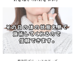 子ども連れ・赤ちゃん連れの来院 OK!! 「毎日が元気で美しく、心身ともに豊かに過ごせるお手伝い」 をコンセプトに、心を込めて全力でお力添えいたします。 朝10時から夜10時まで営業しております。 【最新予約空き状況】 […]