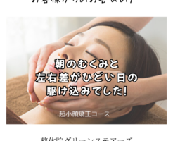 高松市 緑◯様 超小顔矯正 ずっと気になっていたけれど、 半年前に思い切って予約しました。 実は『超小顔矯正』と聞くと、 痛くて怖いイメージがあったんです。 でも、いざ施術を受けてみると全く違いました! 施 […]